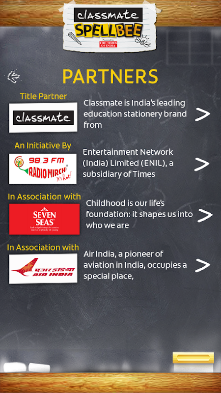 SPELL CHAMPS: Based on Classmate Spell Bee’s TV show the mobile application introduces a new feature Spell Champs for TV Viewers. The feature enables a viewer to participate in the competition on TV at the same time as the participants answer questions on the show. It’s your chance to check if you can match the spelling skills with some of the brightest spellers in the country. Now you can be a part of the spelling extravaganza on television by participating from your phone/ tab screens. You can use the Spell Champs feature only when the TV show is on air.