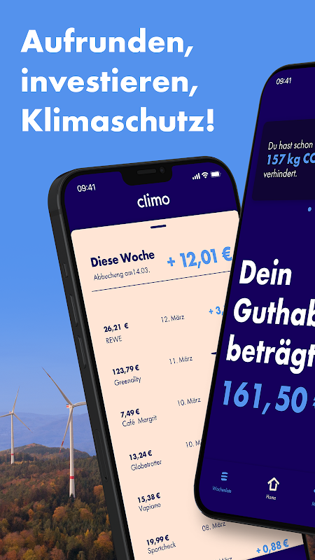 Climo を使用すると、買い物をするときに自動的に切り上げられ、太陽光発電システムや風力発電システムに直接投資できます。最終的には信用と利息が戻ってきます!それまでは、あなたのお金で再生可能エネルギーに資金を提供し、CO2 を防ぐことができます。あなたのお金の 100% がプロジェクトに使われます。手数料や隠れた費用はありません。
