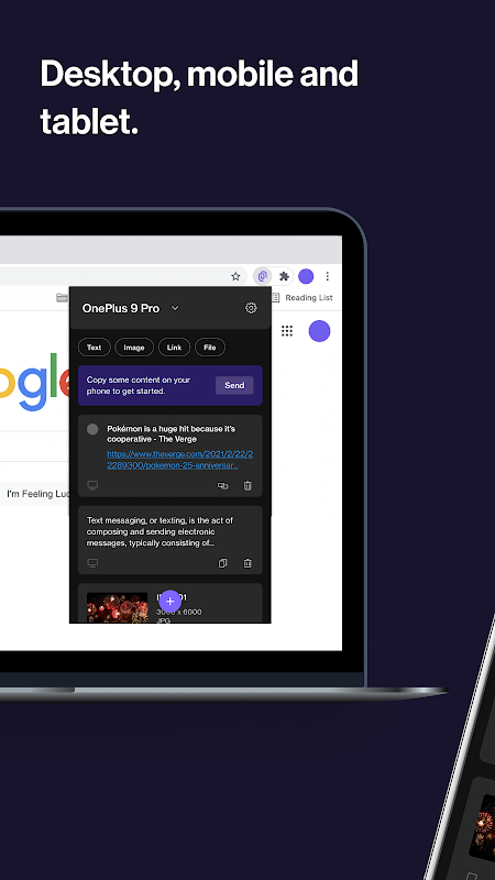 スマートフォンとノートパソコンの間でクリップボードを同期することで、テキスト、写真、ビデオ、ファイルをシームレスかつ安全に転送します。 あるデバイスでコピーして別のデバイスに貼り付けるのと同じくらい簡単です。 Clipt は、すべてのデバイス間のリンクを作成して生産性を向上させます。