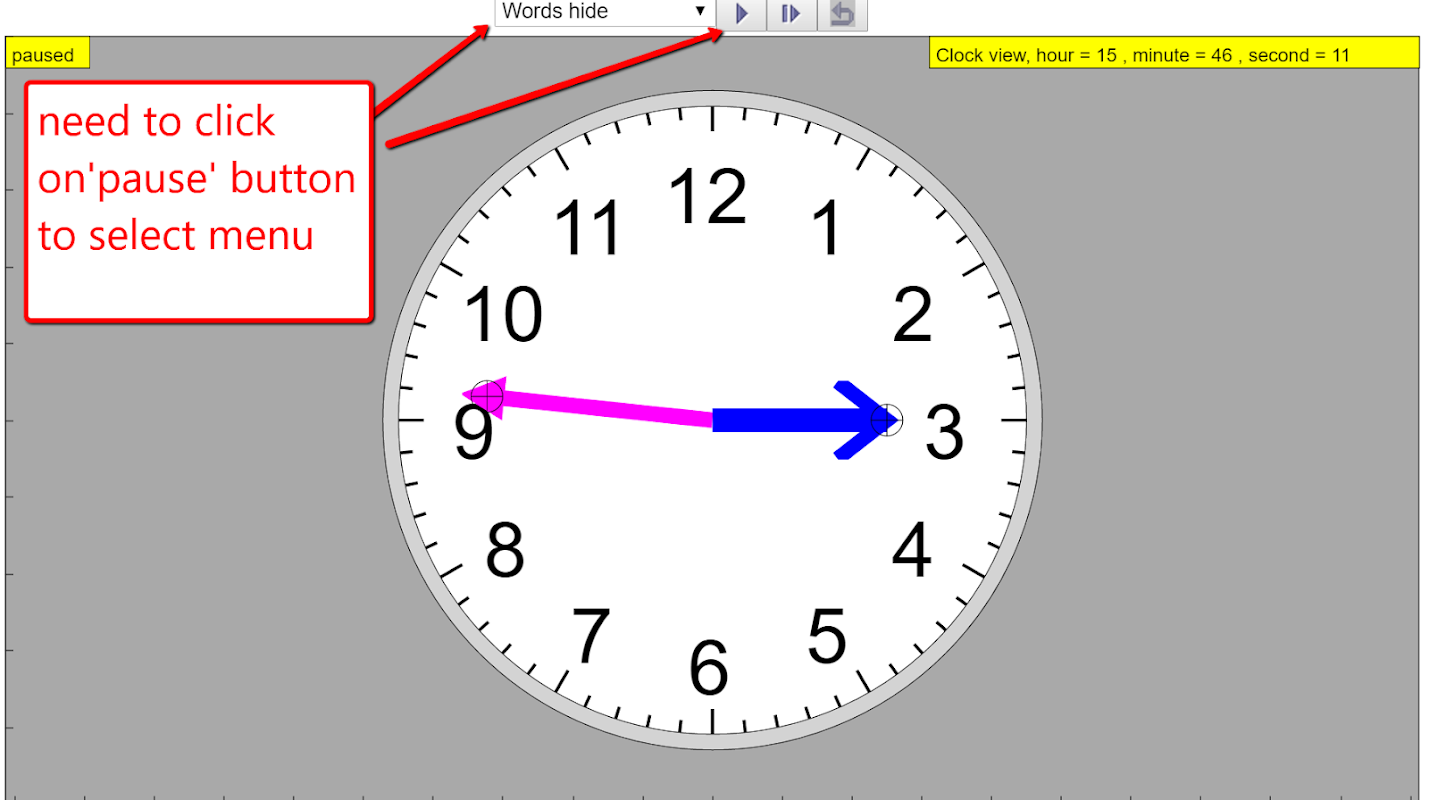 ティーチングシミュレーションはすぐに実行を開始し、実世界の時間を示します。秒(RED)針は、ビューを単純にするためにデフォルトで非表示になっています。ビューは、時(青)と分(マゼンタまたはそれをピンクと呼ぶのが簡単ですか?)の針だけでシンプルです。インタラクティブな要素は、時針、分針、秒針に十字線の円として表示され、それぞれの位置を自動的に計算します。