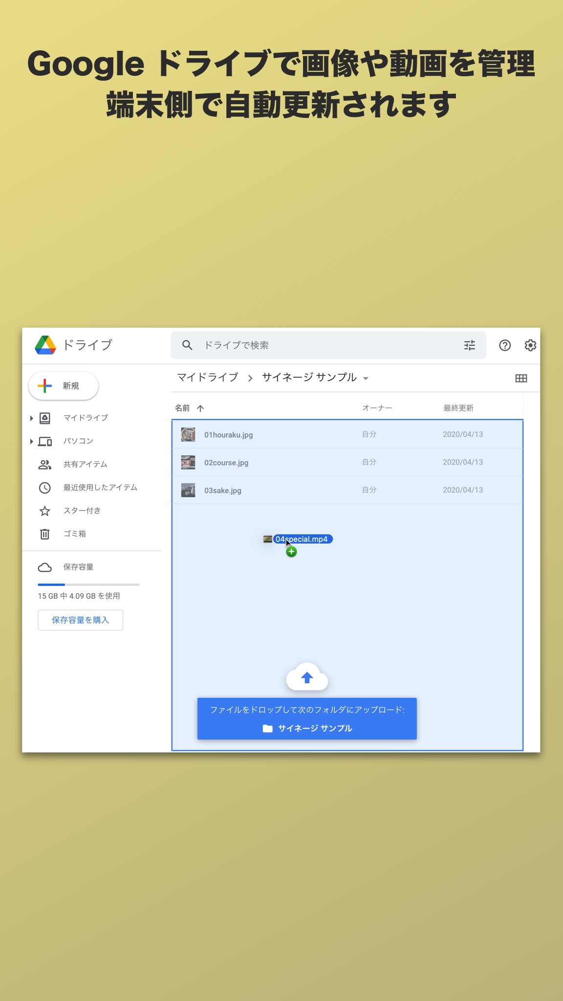 画像や動画を Google ドライブの指定フォルダに置くだけで、サイネージコンテンツが自動更新されます。