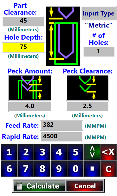 Quickly and easily calculate the time to drill holes on a cnc machine. The calculator calculates the cycle time to drill holes with or without drill pecking and you can input in Imperial (Inches) or Metric (Millimeters). The output is in total minutes for 1 part and up to how ever many you want. The drilling feed rate supported is inches per minute or millimeters per minute and the rapid rates supported are inches per minute or millimeters per minute. This app is a great time saver when estimating the time required for drilling holes on cnc machines especially when using canned drilling cycles like G83 and G73.