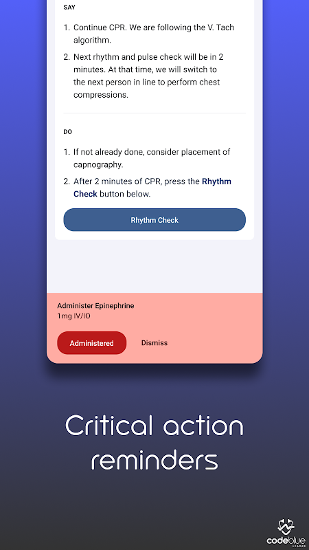 コード ブルー リーダー アプリは、緊張したり、気が散ったりすることはありません。 『コード・ブルー』リーダーは一歩も外さない。証拠に基づいたリアルタイムの状況別の蘇生ガイダンスに従ってください。コード ブルー リーダーに蘇生処置のすべての重要な部分を調整して追跡させて、より明確かつ冷静に考えることができるようにします。