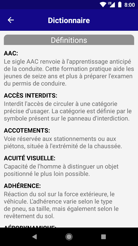 Des cours sur le permis de conduire, les distances de sécurité, le stationnement... Un accès libre aux panneaux de signalisation et à leur définition.