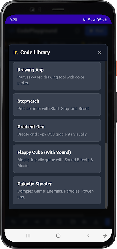 Code Playground は、シンプルで強力なランタイム環境を提供します。Android デバイス上で直接 Web プロジェクトを実行、テスト、実験できます。HTML、CSS、JavaScript のアイデアを外出先で実現したい Web 開発者、学生、そして趣味で開発に取り組む人にとって、Code Playground は最適なモバイル コンパニオンです。