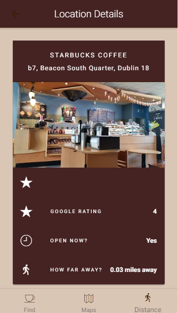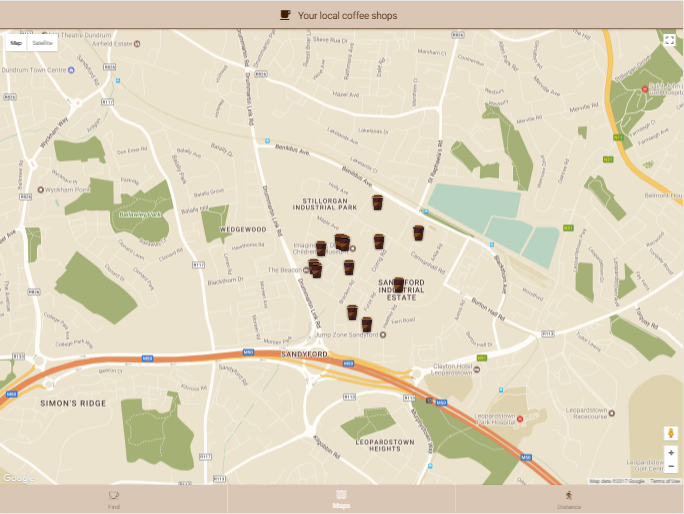 The application uses your Geolocation details and the Google Places API to display the nearest coffee locations on your map. Making it easy to find the best coffee in your local area,