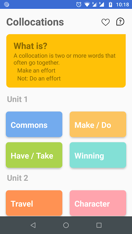 コロケーションの学習は、ネイティブスピーカーのように聞こえる最良の方法の1つです。このアプリケーションは、コロケーションのリストと、それぞれの意味に関連するグラフィカルリソース、およびコロケーションを楽しい方法で学習できる視覚的な演習を提供します。