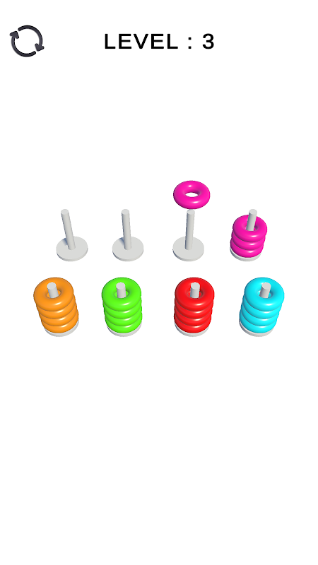 異なる色のリングがランダムに異なる列に配置されています。同じ色のリングを同じ列に集めることが目標です。そのためには、リングを運び、正しい動きをする必要があります。すべての色が同じ列になければなりません。あなたは達成できますか?