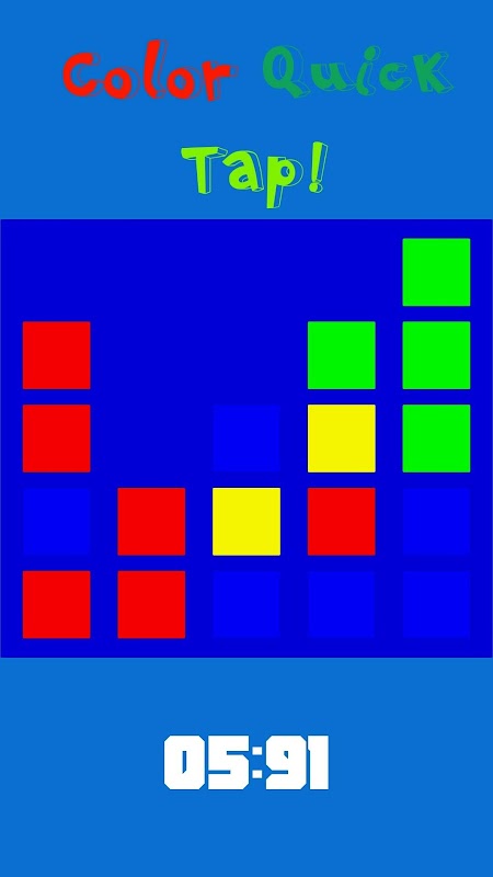 You see a screen with 25 colored squares (4 colors of red, blue, green and yellow) and by tapping once on the screen, the game will start. As soon as the game starts, the background color will blink very quickly with one of those 4 colors and you have to choose a square with the same color to remove it.
