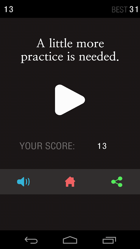 Does the color match the text? You should make the right choice based on what you see in a short time. Be careful when the color not match the text.Believe me, this game will drive you crazy and you just cant stop playing it.Try to see where is your best!