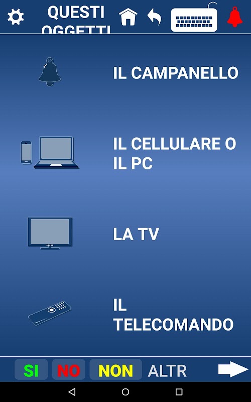 Nella barra inferiore, in ogni schermata, ci sono i pulsanti “Si/No/Non so/Altro” per la comunicazione in entrata ed è prevista la possibilità di selezionarli per ingrandirli, e facilitare uno Scambio Comunicativo Minimo anche con persone gravissime dal punto di vista comunicativo e linguistico.