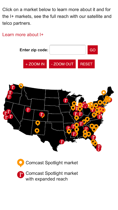 Comcast Spotlight reaches roughly 35 million homes and dozens of interconnects in top markets. We have presence in 8 of the top 10 DMAs and 19 of the top 25 DMAs. Use this section to learn about our markets and I+, which gives advertisers even greater reach through our satellite and telco affiliates.