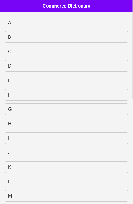 検索機能: このコマース辞書アプリにはクイック検索機能があります。用語を調べる必要がありますか?強力な検索機能を使用して、定義と意味を即座に見つけます。これにより、商取引用語の学習や研究が簡単になります。