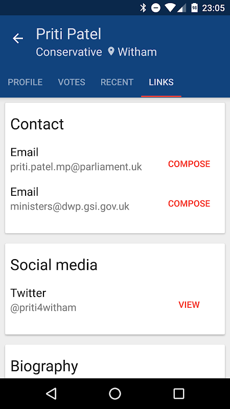As well as recent debate activity, each MP profile displays their career history, an overview of their voting tendencies, and links to relevant social media, websites and contact information.