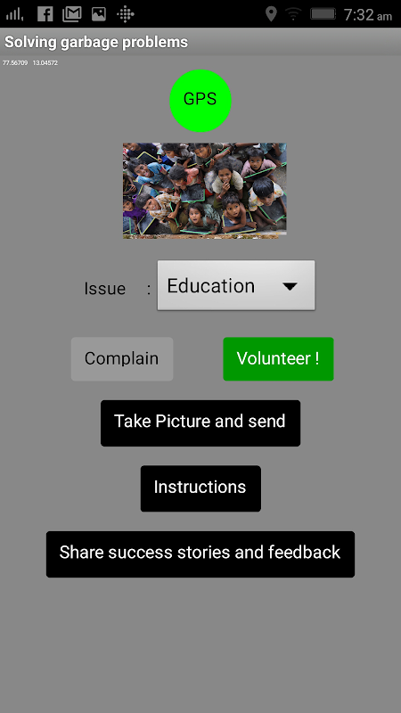 Become a superhero and create awareness about garbage or other problems in your community! Switch on GPS before opening app. The App opens camera as soon as you click on it (this saves time and adds versatility to capture issues like traffic violations immediately). Take the picture and save it. Then, wait for the GPS to calibarate and for the GPS button to turn green. In the mean time select the issue from dropdown menu and mode of action by clicking on complain or volunteer. Once the GPS is locked, the app automatically allows you to share a preset message, location and image through social media. You can choose any social option but emailing might be simpler. You can also change the preset custom message. Hopefully, this will take us one step towards a cleaner future! :)