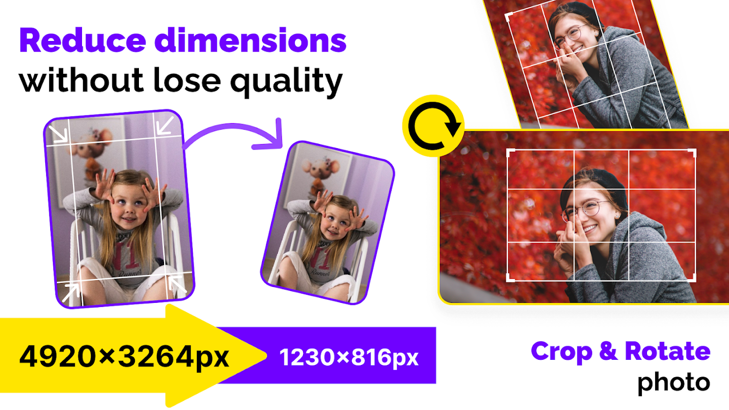 Photo Reduce Size アプリは、サイズ変更と圧縮を超えたものです。Image Resizer を使用すると、Photo Compress - Resize Image アプリ内で縮小した画像を直接圧縮できます。
