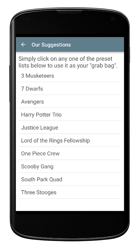 アプリの本来の目的上のねじれは、この機能を使用すると、ランダムにビルド名プールから何かに連絡先のすべての名前を変更することができます。プールには、最大5名を持つことができます。また、「アベンジャーズ」と「3つの銃士」のような世界のお気に入りのグループのいくつかの後にみんなの名前を変更するために、アプリの事前に構築された「グラブバッグ」のいずれかを使用することができます。