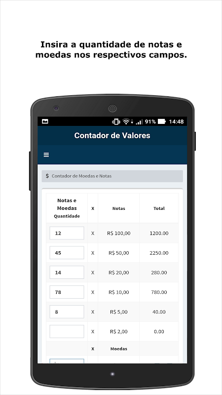 Insira a quantidade de cédulas e moedas e verifique o valor final. Contador ideal para contagem de valores em lojas e pequenos comércios.