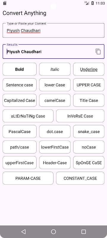 Convert Case は、テキストをさまざまなケースやスタイルに簡単に変換できるように設計された、多用途で使いやすいアプリです。テキストを大文字、小文字、タイトルケースに変換する必要がある場合でも、吹き出しテキストなどの独自の形式に変換する必要がある場合でも、「大文字と小文字を変換」を使用すると問題を解決できます。ソーシャル メディアへの投稿、クリエイティブなプロジェクト、日常の執筆に最適なこのアプリは、テキストを常に目立つようにします。直感的なインターフェイス、リアルタイム プレビュー、あらゆるニーズに合わせた幅広いカスタマイズ オプションを備えたシームレスなエクスペリエンスをお楽しみください。