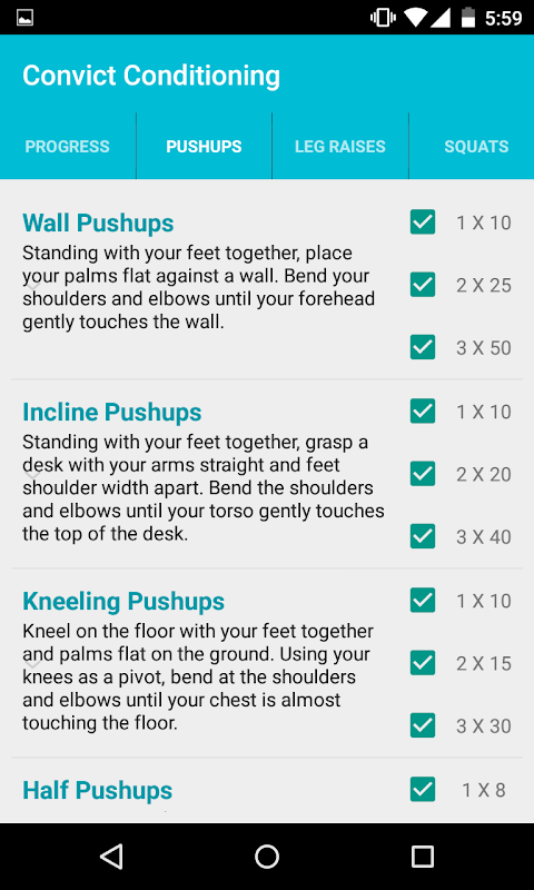 The Convict Conditioning app is like having a personal strength trainer at your service. The app will teach you how to do every Convict Conditioning workout. It tells you the order and how many sets and reps you do, and even tracks your progress!