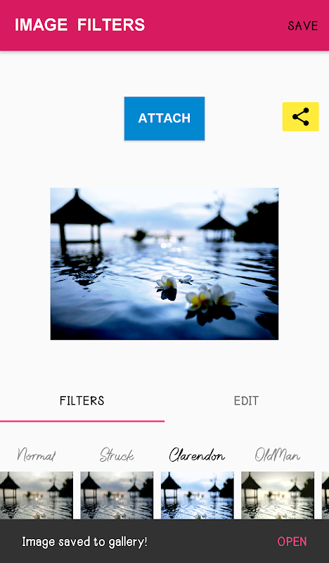 Cool Image is a simple app for editing images with filters. With this app, you need to select the required image from your gallery by selecting the ATTACH button. Then you can apply the filter of your choice from the FILTERS section. You can also control features like brightness, contrast, saturation under the EDIT section. You can save the edited image by clicking the SAVE button on the top. You can also share the image by clicking the share button.