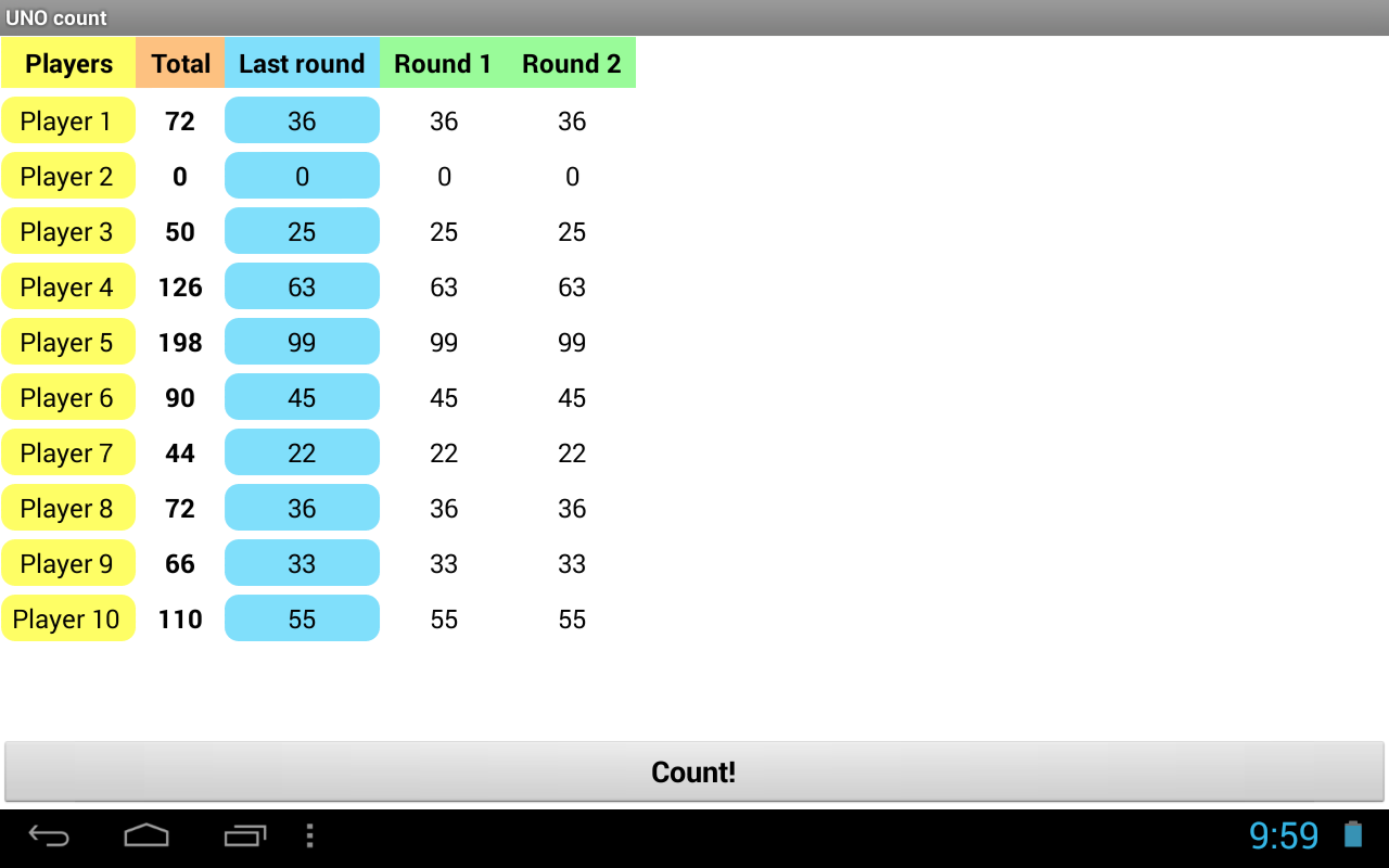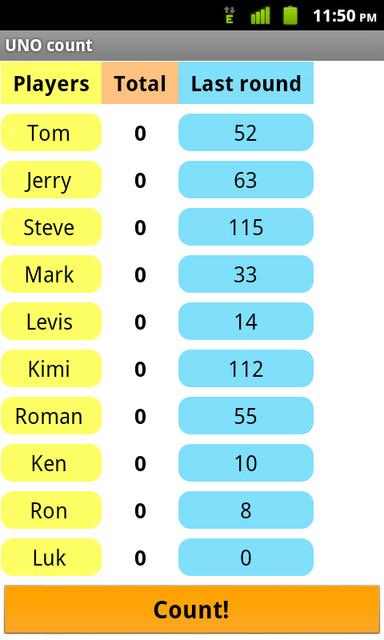 UNOのカウント - お友達とUNOをプレイするときにスコアをカウントするのに役立ちますシンプルなアプリを。単に各プレイヤーとプレスのための最後のラウンドスコア入力し、「カウントを!」ボタン - 「UNOのカウントは、「残りの作業を実行します。