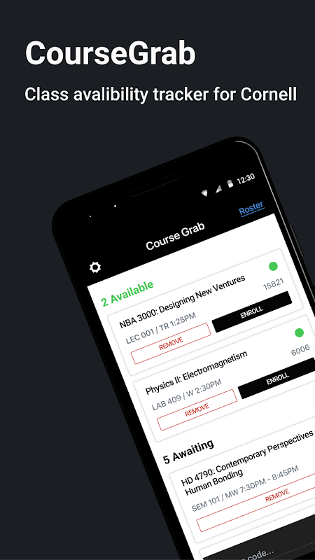 CourseGrabは、登録したいコースの空席を学生に通知することで、学生の登録体験を向上させます。CourseGrabは現在、コーネル大学のクラス名簿に対応しています。アプリケーションの主な機能は次のとおりです。