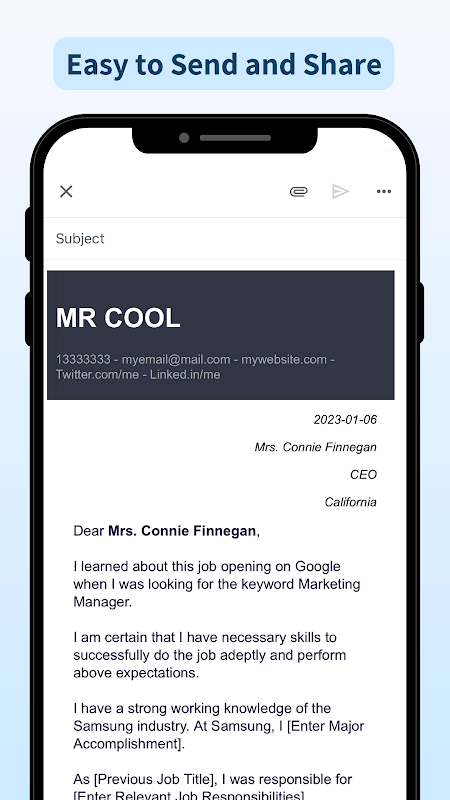 カバー レターを PDF 形式で簡単に共有したり、カバー レターの内容をコピーして貼り付けたり、履歴書を添付したりできます を カバー レター に送信し、レター ジョブ アプリケーションのフォーマットを保持したまま雇用主に直接送信します