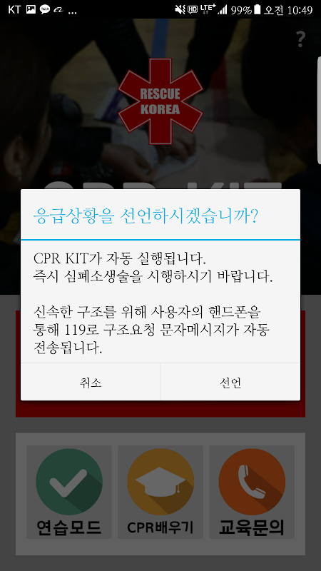 * 본 어플리케이션을 상업적 목적으로 무단전재하거나 재배포하는 것은 금합니다. 다만 상업적 목적이라 하더라도 심폐소생술 교육목적으로 유료 또는 무료 강의에 당해 어플리케이션을 사용하는 경우는 자유롭게 이용하실 수 있습니다. 교육목적의 어플리케이션 사용과 관련해 레스큐코리아에 문의하시면 추가적인 가이드라인이나 효과적인 어플리케이션 사용법을 안내 해 드립니다.