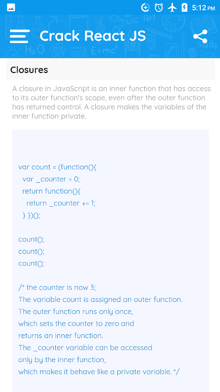 Crack ReactJs provides you a wide set of Interview Question and Answer bank which includes JavaScript, Redux, Webpack collected from various authentic sources and guides you to get better exposure in your career. This app also used for learning react js from basic including java script. It supports offline reading of question sets. It's best for beginners who wants to practice reactjs coding.