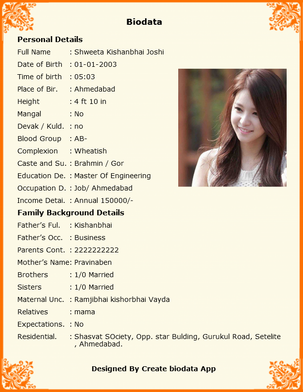 このCreateBiodataApp&Webは、要件に応じてバイオデータをすばやく作成します。バイオデータを電子メールで送信する場合は、バイオデータをPDFまたは画像で保存して電子メールで送信してください。