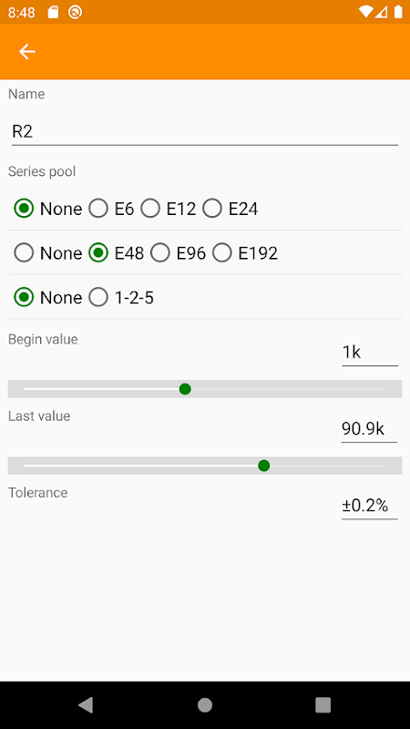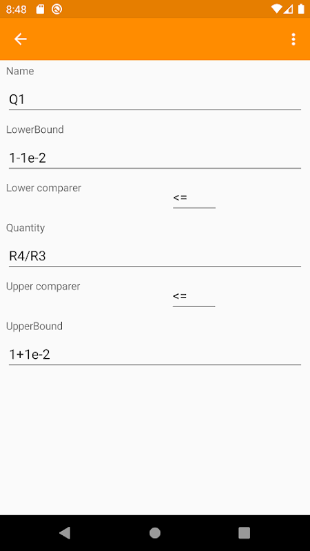 Instead of equations, inequality pairs are input as criteria for determining whether the mathematical outcome of certain quantities based on a set of component values be acceptable and hence a solution found. Every combination of component values in the E-series is tested to see if it is a solution. Solving processes are accelerated with proprietary optimizations. Users may limit the criteria to control the physical tolerances as best as they wish.