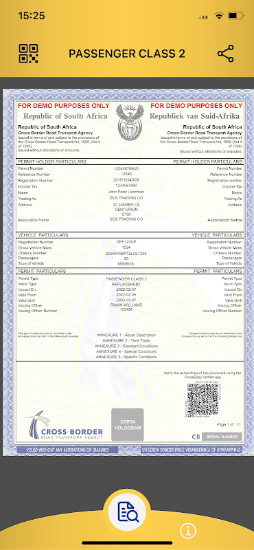 CrossEasy Permit Verifier を使用すると、デバイスにアプリがインストールされている人は誰でも、オフライン時にシステムから発行された許可証の信頼性を検証できます。これは、アプリを使用して許可書の右下にあるバーコードをスキャンすることで行われます。