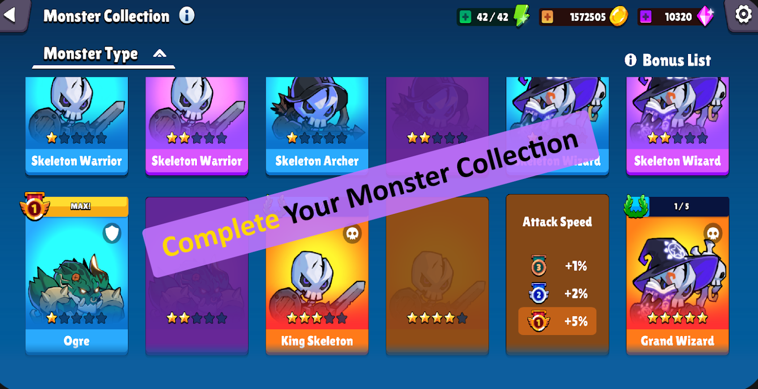 📜 モンスターコレクション:様々な敵を追跡して倒しましょう! 何度も倒すと特別なボーナスがアンロックされ、防御力を強化するユニークな報酬を獲得できます。