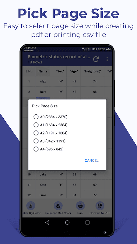 CSV file reader can also be used as csv to pdf converter, so csv to pdf converter will allow to you to select first pdf page size and after will convert your csv file to pdf. CSV File Viewer: CSV to pdf converter app will also allow you to print your csv file directly from the App.