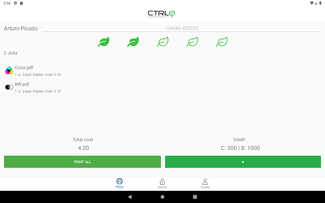 Send your documents to CTRL P and release them scanning the QR code of the printing device. You can also unlock the device and see your stats.