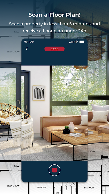 5 分でフロアプランをスキャンします。 2D、3D フロアプラン、またはビデオレンダリングを受け取ります。