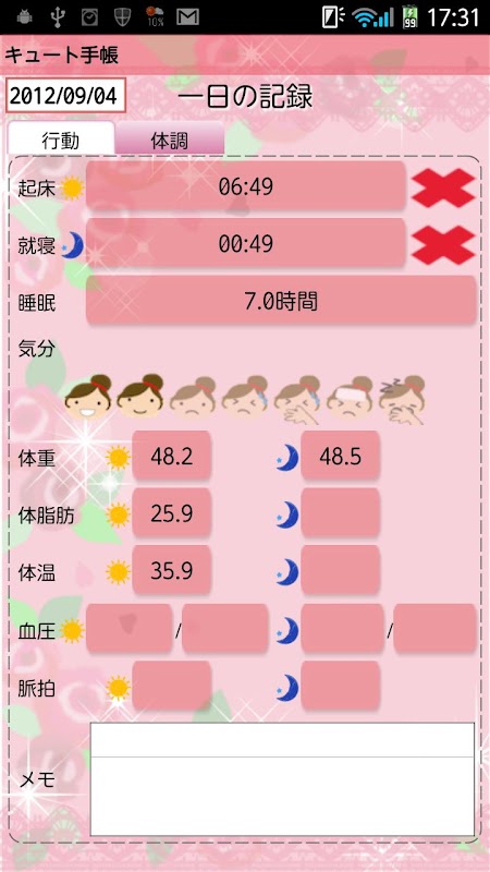 残せる記録は、起床時間・就寝時間・睡眠時間・体調(顔アイコンをタップ)・体重(朝晩)・体脂肪率(朝晩)・(基礎)体温(朝晩)・血圧(朝晩)・脈拍(朝晩)・メモです。