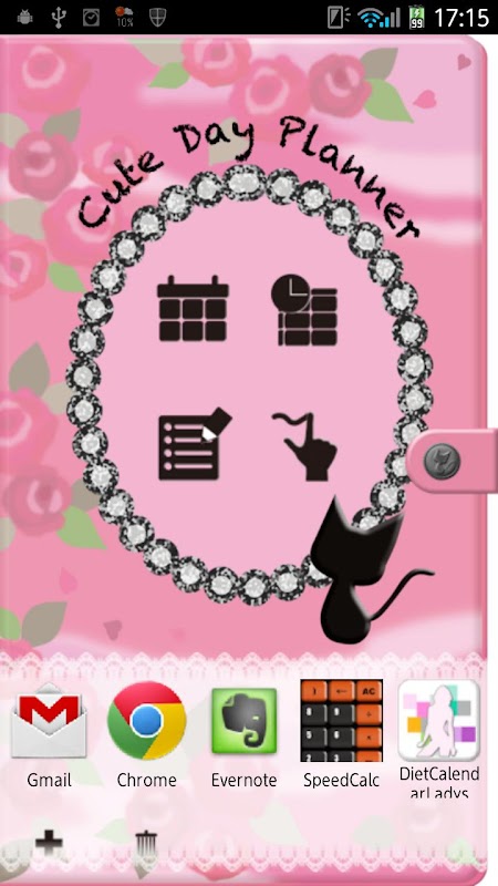 2.手帳の表紙下、白いレースの帯部分は、キュート手帳を使いながら起動させたい、別アプリをこちらに追加していくことができます。こうすることで、キュート手帳を終了させることなく、別アプリも起動できるというすぐれ機能です!