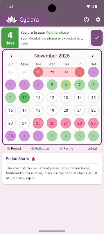• 高精度な予測:Cyclara のアルゴリズムは使うほど賢くなり、次の生理日や妊娠しやすい期間を高い精度で予測します。