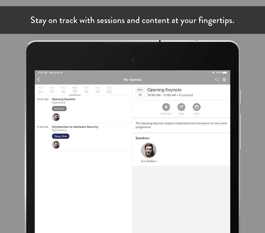 The Daimler Event App lets invited attendees submit questions, message other delegates and exchange digital business cards, schedule meetings, complete surveys, create personal agendas, study virtual libraries and meeting information, review case studies, browse speaker and attendee profiles, follow presentations, take notes, save items for after your event and much more.