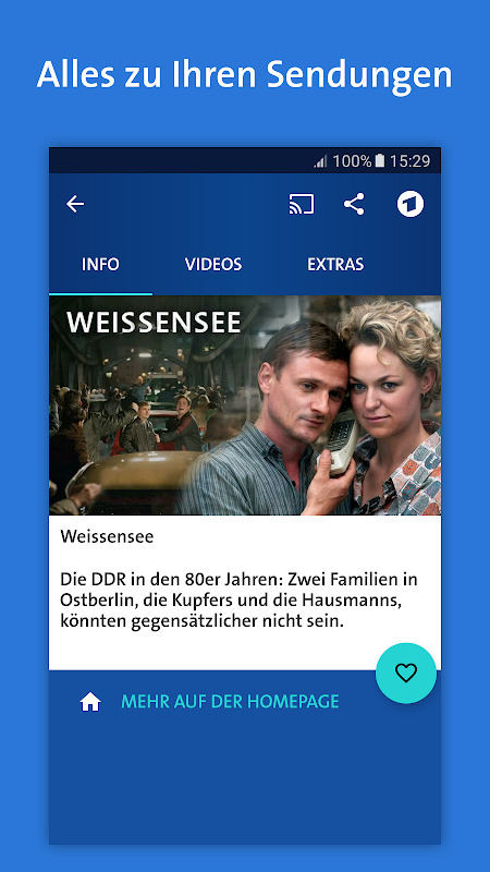 Mit der neuen Das Erste App kommen Sie noch leichter an Ihre Lieblingssendungen und Videos. Der neue Programmkalender vereint Programmvorschau, Livestream und Videos zu vergangenen Sendungen auf einen Blick. Redaktionelle Highlights und persönliche Empfehlungen finden Sie geordnet und übersichtlich auf der Startseite. Videos finden Sie schnell und leicht über den Programmkalender, über ein A-Z und über Rubriken wie Dokumentationen, Filme, Krimis, Nachrichten, Kinder, Ratgeber oder Kultur und Wissen.