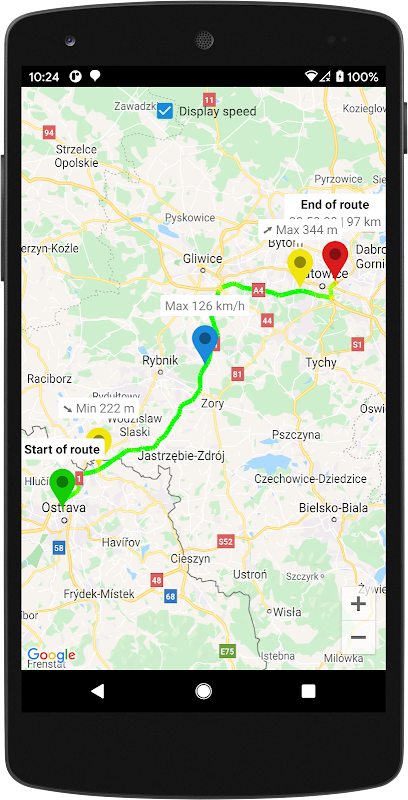 記録されたルートは、Googleマップで速度レイヤーとともに表示されます。