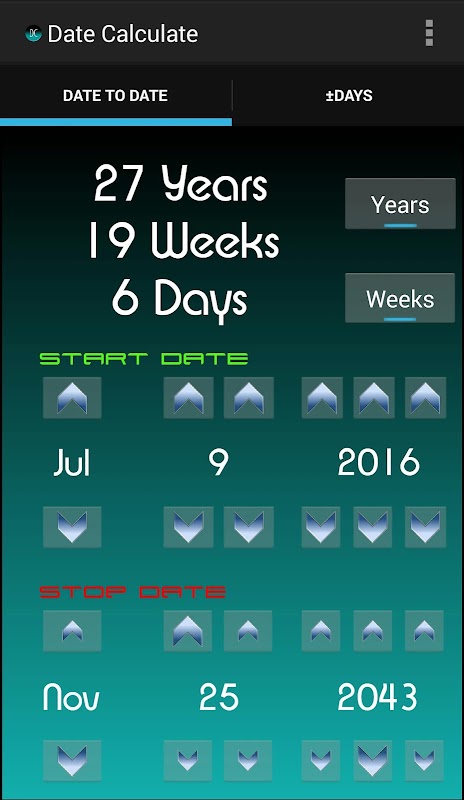 Choose the +/- Days mode to pick a date, add any number of days or weeks in the future or past and get the resulting date!