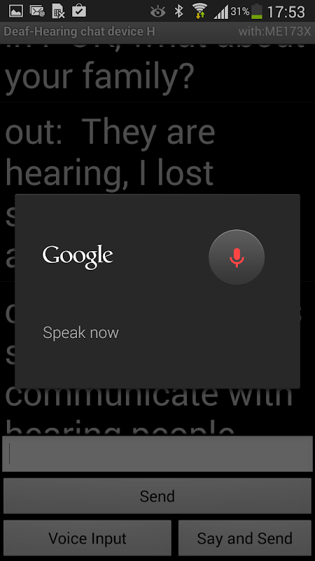 The application for the device-H, called Deaf-Hearing Chat Device H, enables a hearing person to type text messages on a virtual keyboard or using voice input (the button “Voice Input” or the button "Say and Send" ). You need an Internet access for voice input. To send a message to device-D you should press the button “Send”. The messages, received from the device-D, are shown on the display.