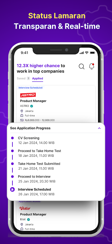 • フィルター berdasarkan jabatan、perusahaan、lokasi (WFO、リモート、ハイブリッド)、gaji、pengalaman、lainnya