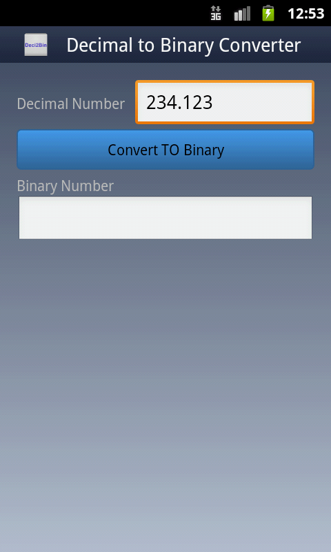 このアプリは、バイナリシステムに小数から数値に変換します。だけでなく、浮動小数点数(例:123.54):このアプリは、両方の整数(121 Eg)をひそかすることができます。