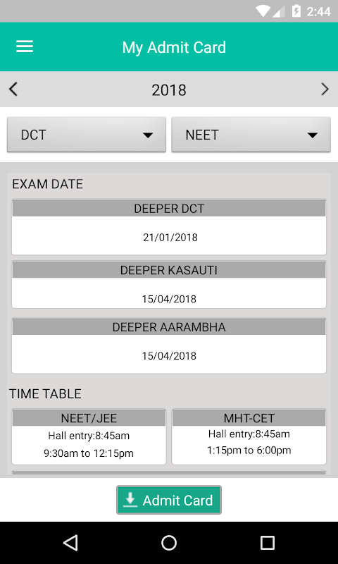 JEE (Main) Exam :- This entrance exam is conducted for IIT, NIT and Government, Private Engineering institutions. The paper consists of 30 MCQS each of Physics , Chemistry and Maths of 11th and 12th std. NCERT Syllabus. The registration of DEEPER exam starts from first week of August every year and ends on 30th November. DCT-JEE is conducted in 3rd week of January and Kasauti-JEE is conducted in 3rd week of March every year.
