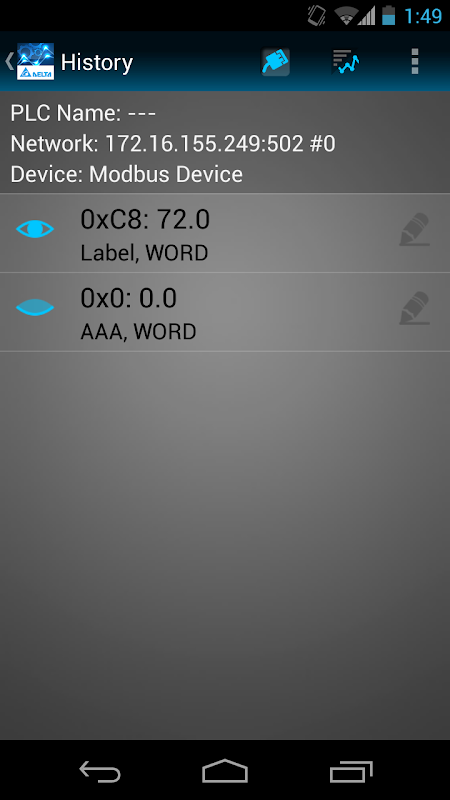 With Delta Smart VIEWer, Users can monitor and edit PLC and Modbus data via Wifi. With the monitored data shown in run charts, users can easily and quickly master the current status and recorded trends of the equipment for proper on-site adjustment.