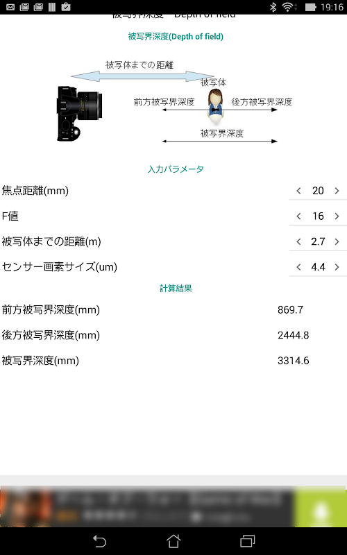 レンズの焦点距離、F値、被写体までの距離、センサーの画素サイズを指定することにより前方被写界深度と後方被写界深度を算出します。